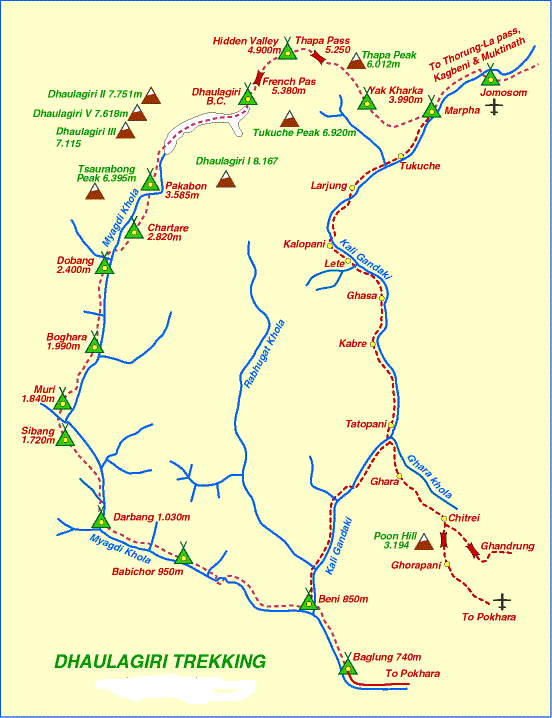 Trekking around Dhaulagiri(8167mt), the 7th highest mountain stands for an adventure into the wild. This trek has been designed to capture the best of Nepal's most popular trekking region, while avoiding the heavy traffic of the Annapurna Sanctuary trails. It's nevertheless a demanding and remote wilderness trek that completes a challenging circuit around the massif. Few trekkers have explored the far side of Dhaulagiri and had the satisfaction of completing this outstanding trek. The Dhaulagiri trek has you crossing two challenging high mountain passes, which are the French Pass at 5380m and the Thapa Pass at 5250m. The Dhaulagiri Circuit can be immensely rewarding as you are walking through the most beautiful scenery the world has on offer, though you do need a sense of adventure and an increased ability to deal with unexpected. We arrange the Dhaulagiri Circuit from September to December and from March to May. All our guides and porters are experienced and licensed.